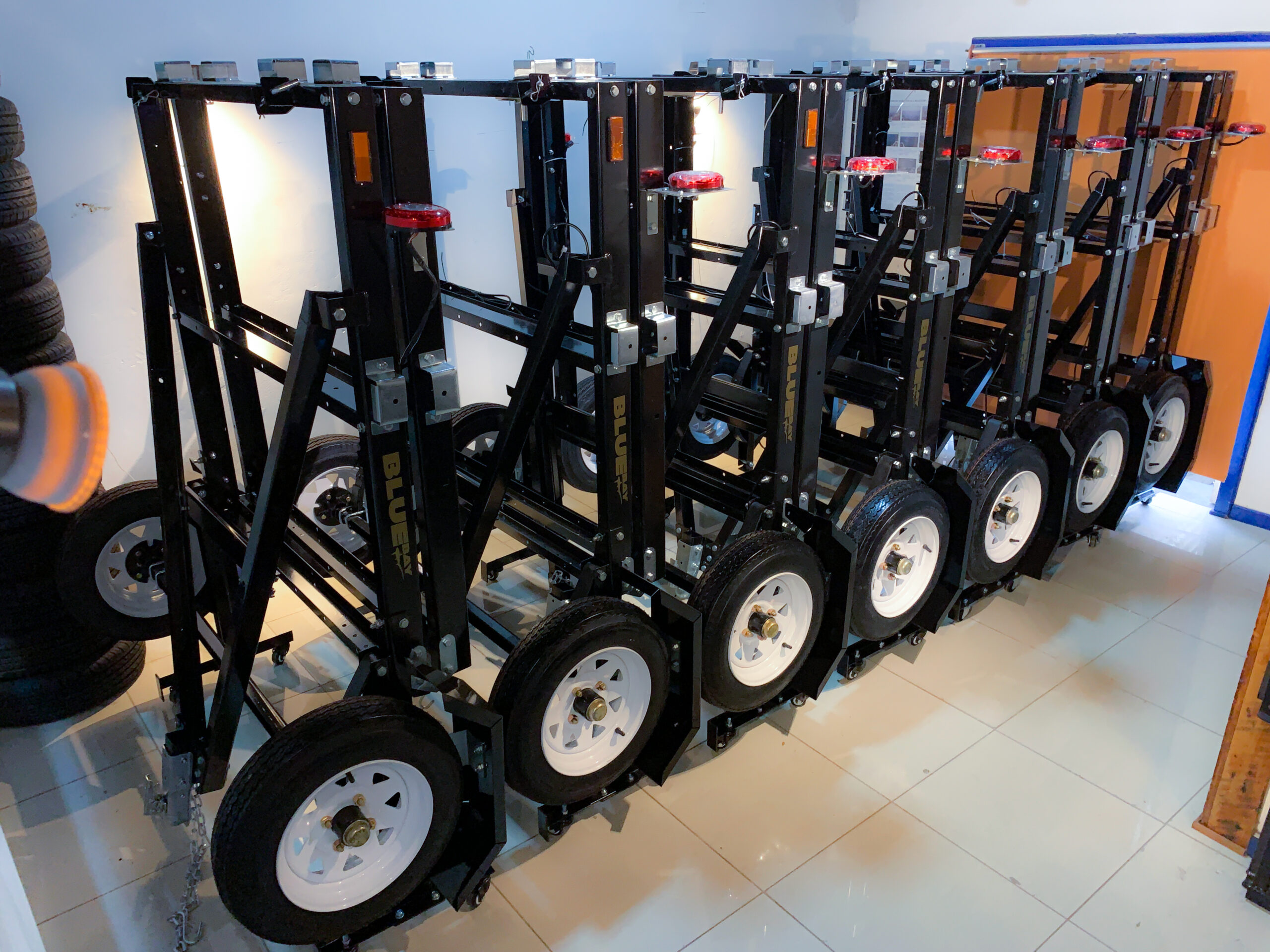Este carro de arrastre multifuncional plegable Bluebay, se caracteriza por el poco espacio que ocupa al ser guardado de pie. El espacio de fondo al estar plegado es de sólo 60 cm, permitiendo que sea guardado en estacionamientos de edificios detrás de los vehículos.